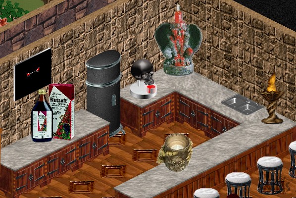 Nochmal ein Bild der Bar, diesmal richtig verschönert. Für diejenigen, die keinen Blutwein mögen, gibt es extra Blutsaft. Natürlich ganz aus roten Früchten.