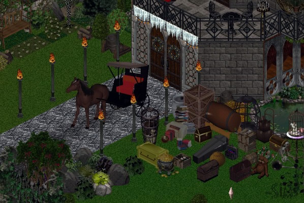 In der ausgebeulten gelben Truhe befinden sich klaustrophobische Schlossies mit Reisefieber. Ansonsten hat sie wirklich nur das Nötigste eingepackt, was ein Gosty halt so auf Reisen braucht. Etwas Taschengeld, einige Getränke für die lange Fahrt, ihr Kuscheltier, ein bis zwei Pokerfreund gegen die Langeweile, Lesestoff und wirklich nur die allernotwendigsten Kleider. Ganz rechts kann man sehen, das wir wohl einen neuen Gepäckträger bis zu ihrer Rückkehr bestellen müßen.